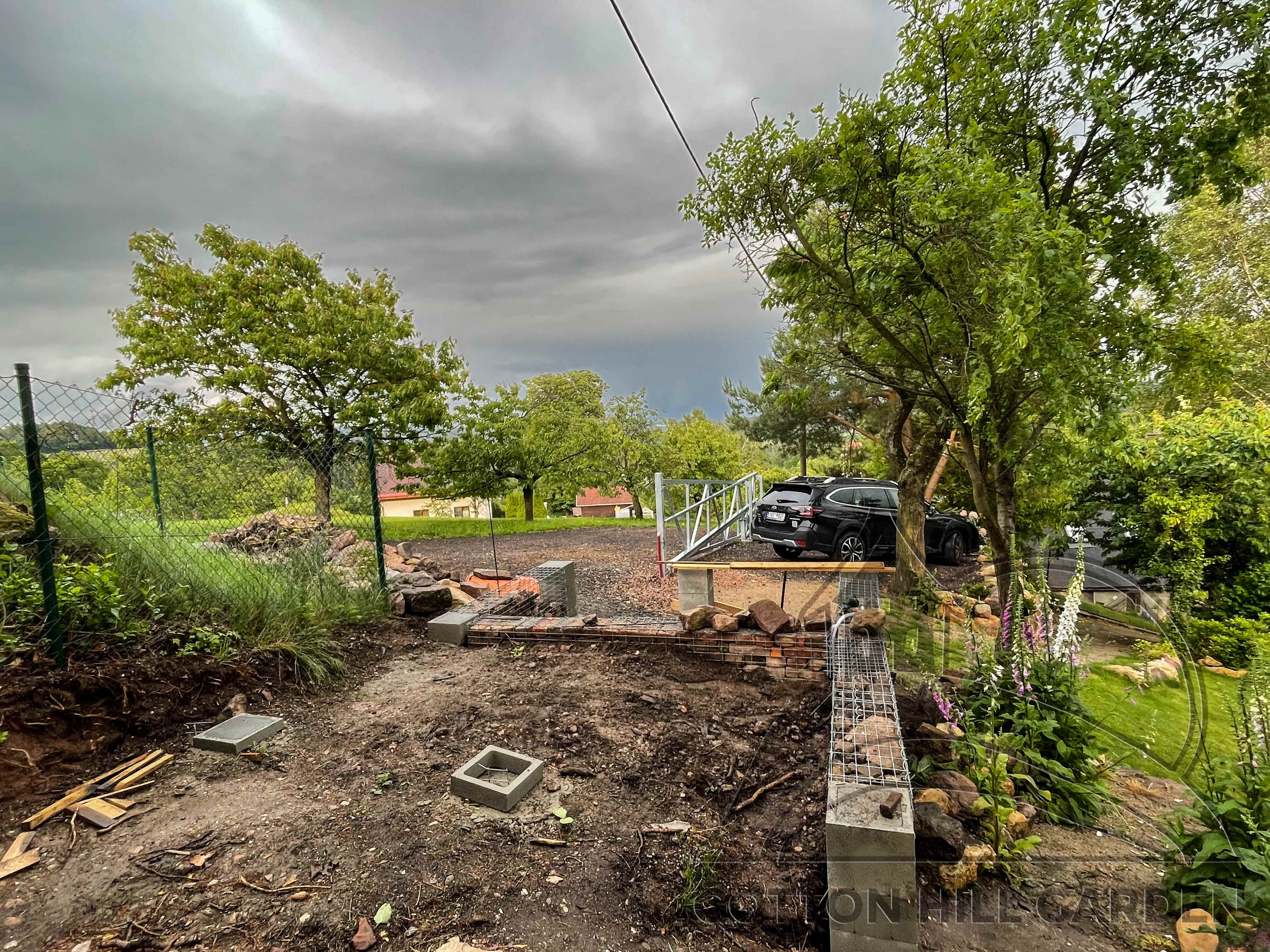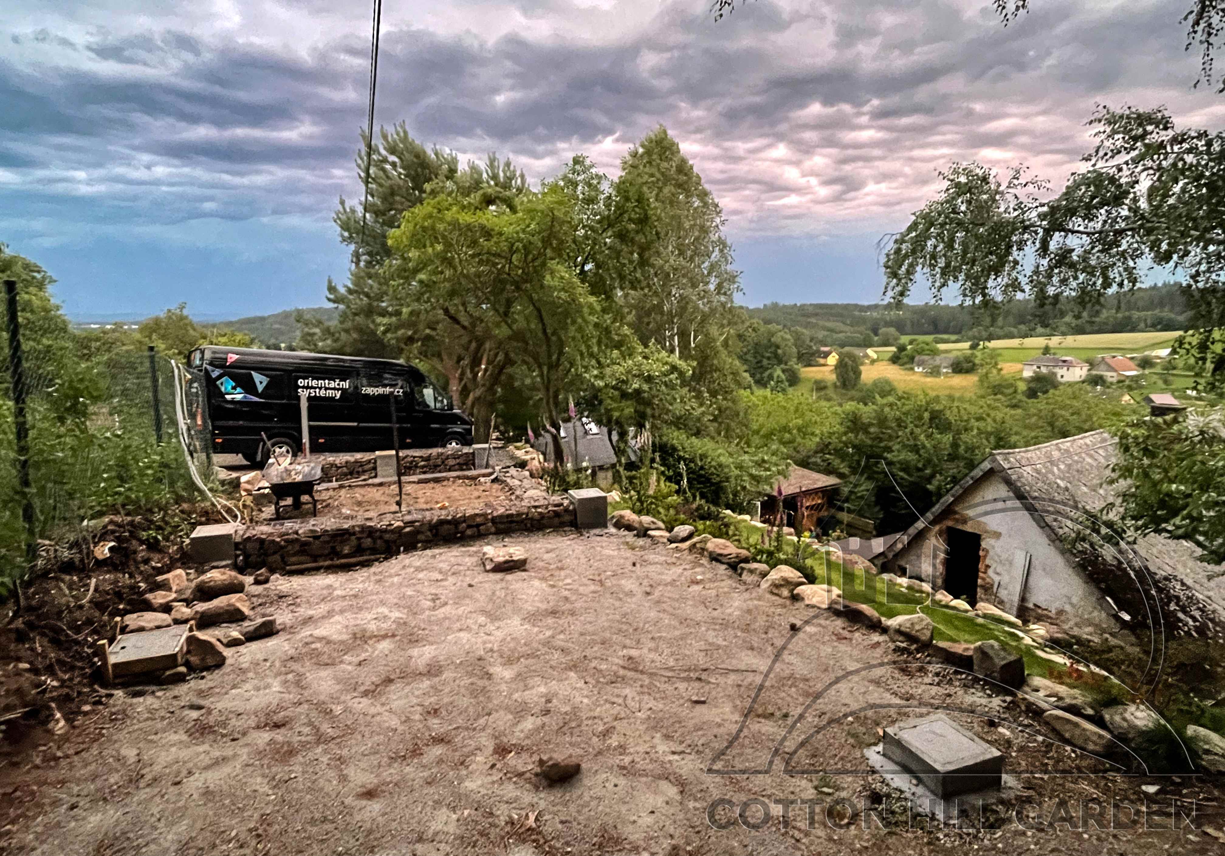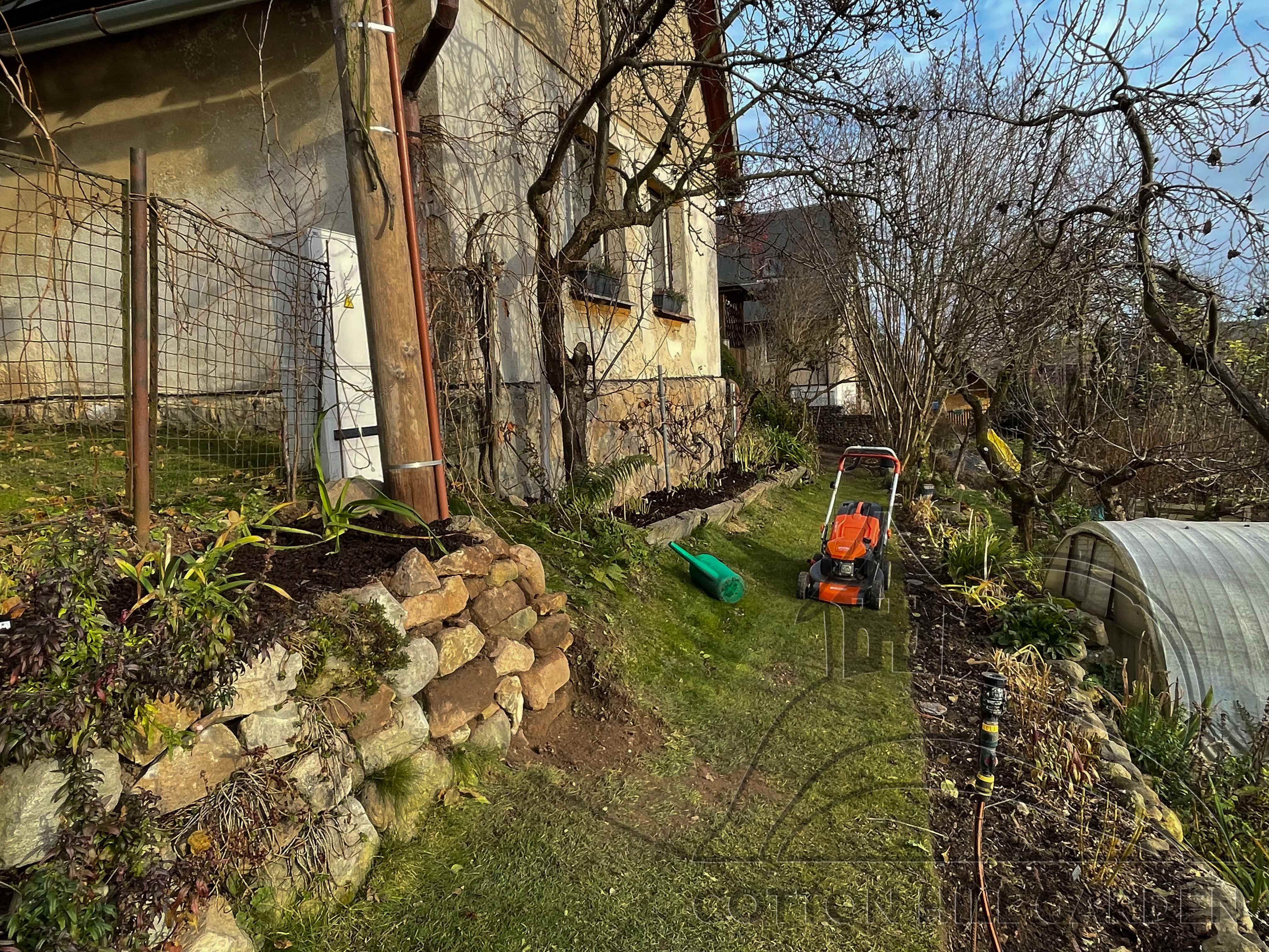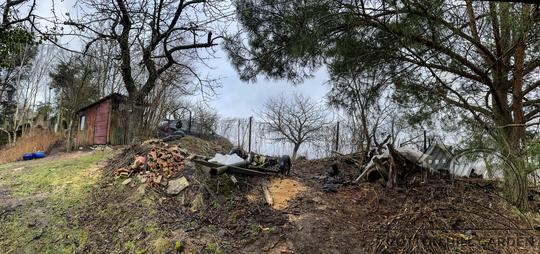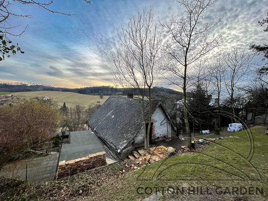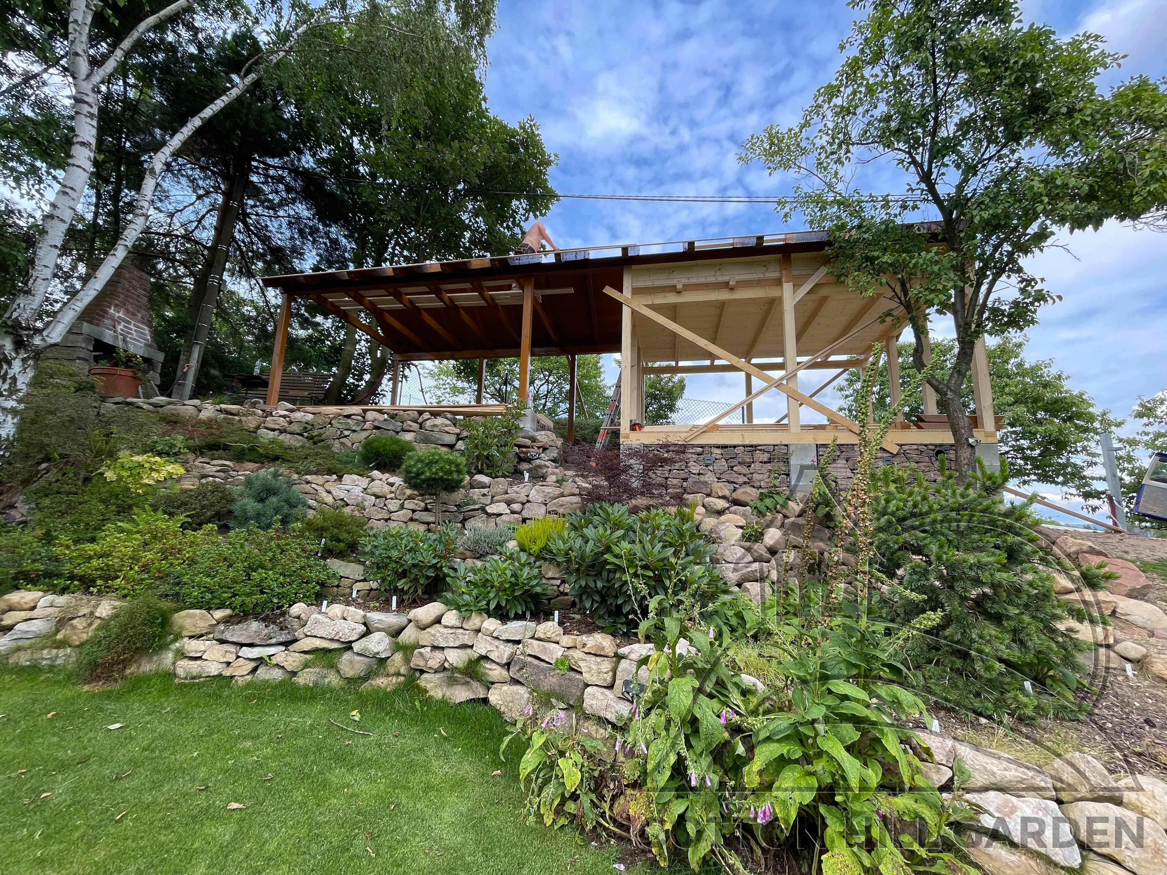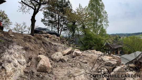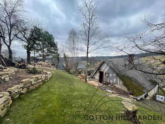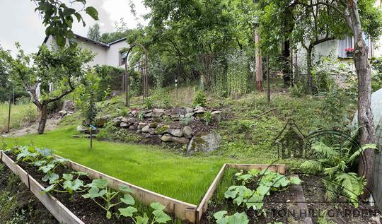 ZPŘÍSTUPNÍ DŮM PRO ÚČELY BUDOUCÍ STAVBY, VYTVÁŘÍ TRAVNATOU TERASU S KRÁSNÝM VÝHLEDEM DO KRAJINY. V NEPOSLEDNÍ ŘADĚ TARAS BUDE DOMOVEM ČAROVĚNÍKŮ, AZALEK A SKALNIČEK.