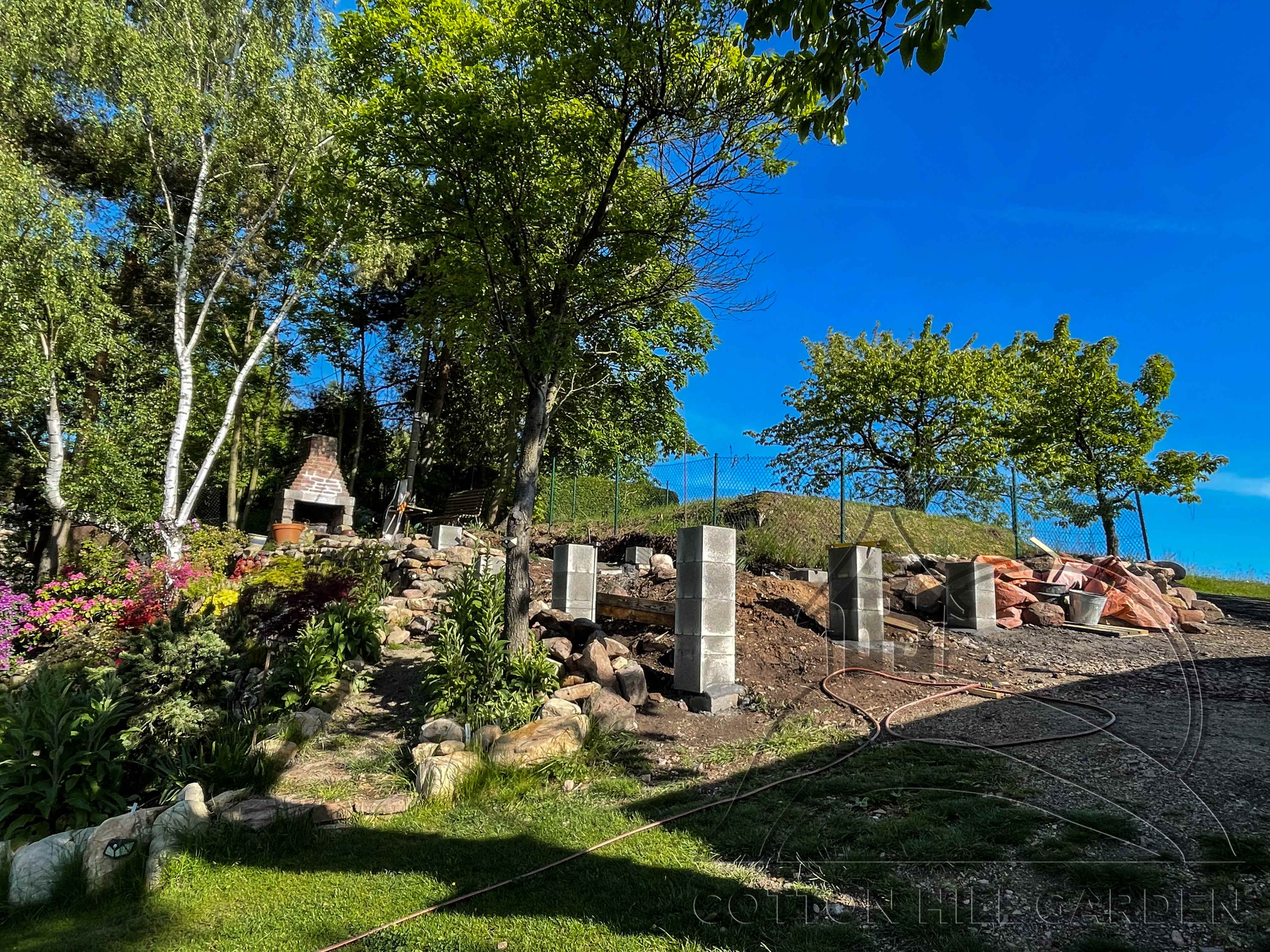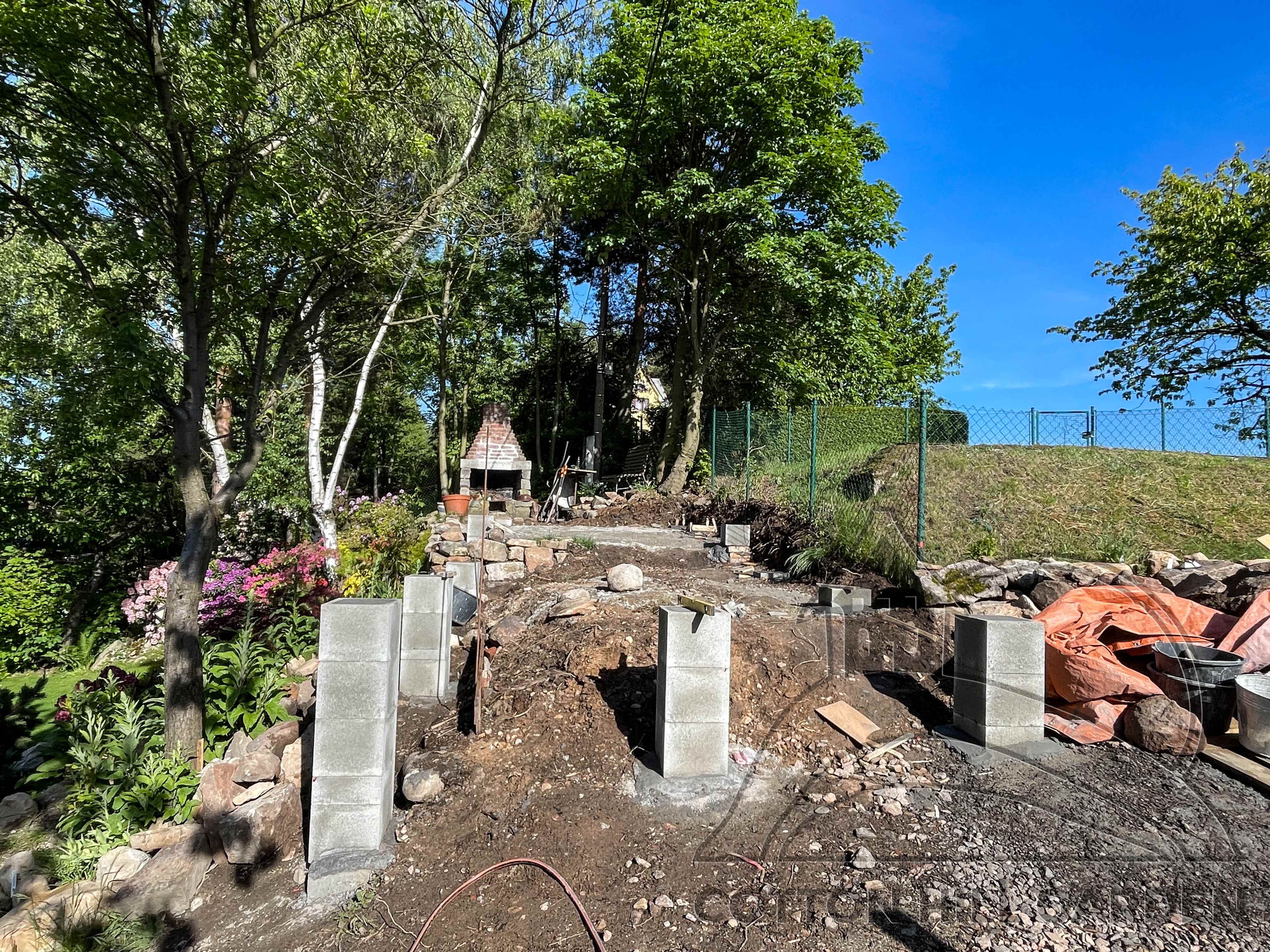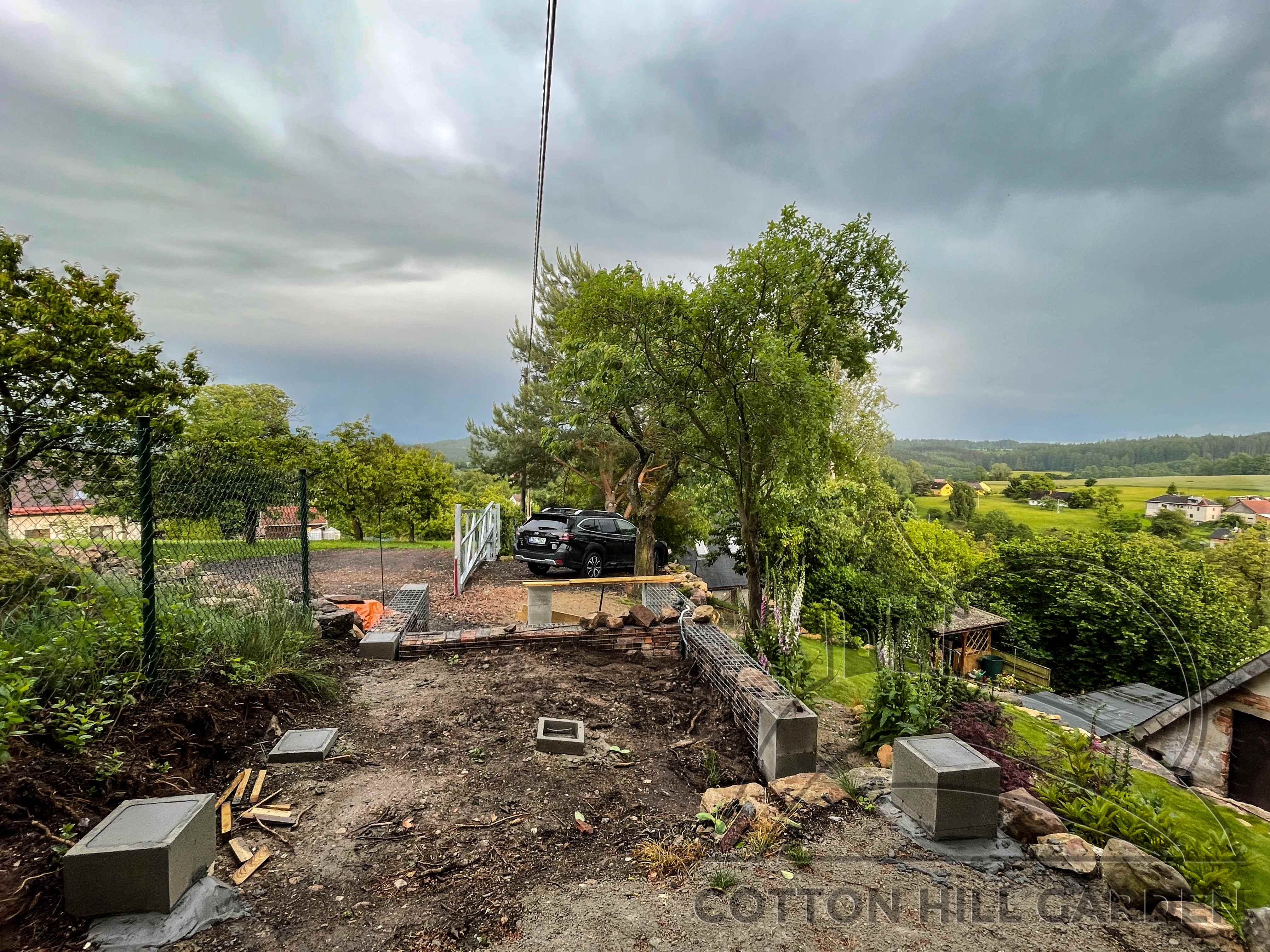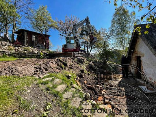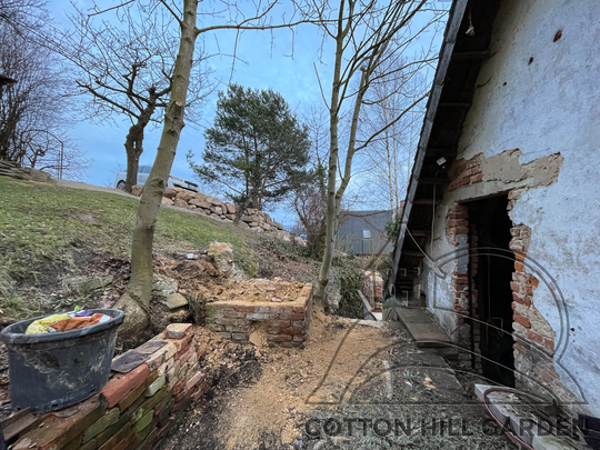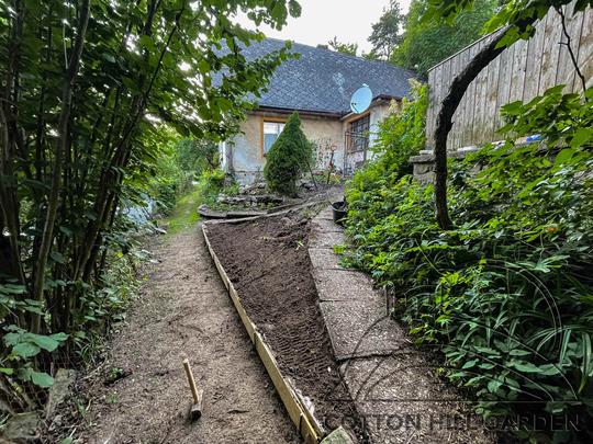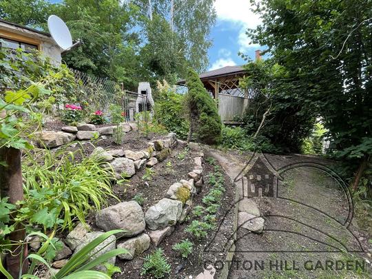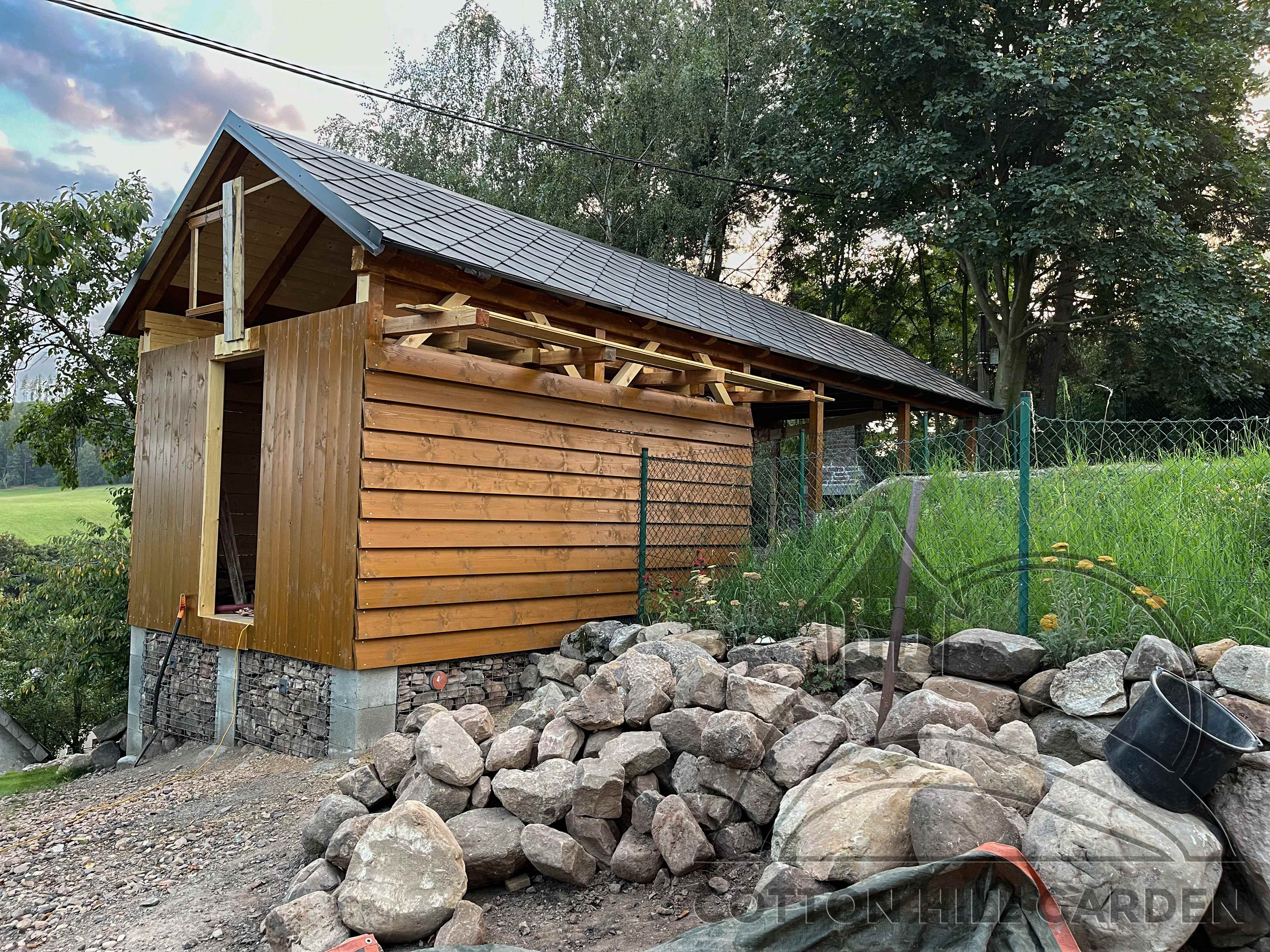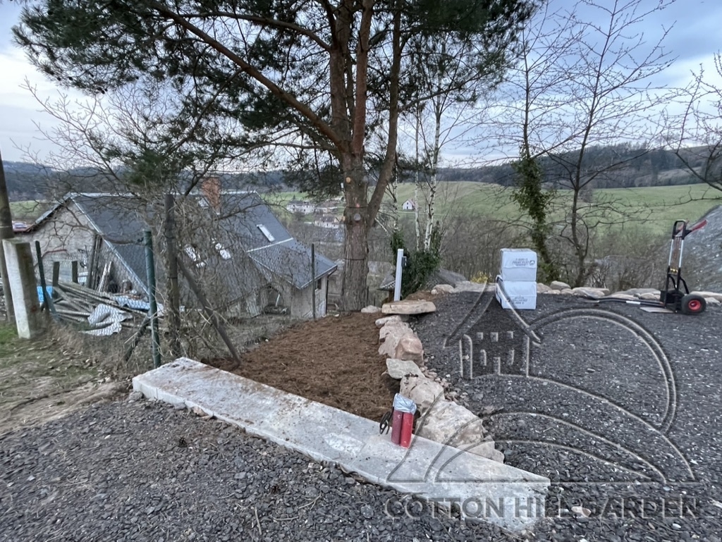 ZPŘÍSTUPNÍ DŮM PRO ÚČELY BUDOUCÍ STAVBY, VYTVÁŘÍ TRAVNATOU TERASU S KRÁSNÝM VÝHLEDEM DO KRAJINY. V NEPOSLEDNÍ ŘADĚ TARAS BUDE DOMOVEM ČAROVĚNÍKŮ, AZALEK A SKALNIČEK.