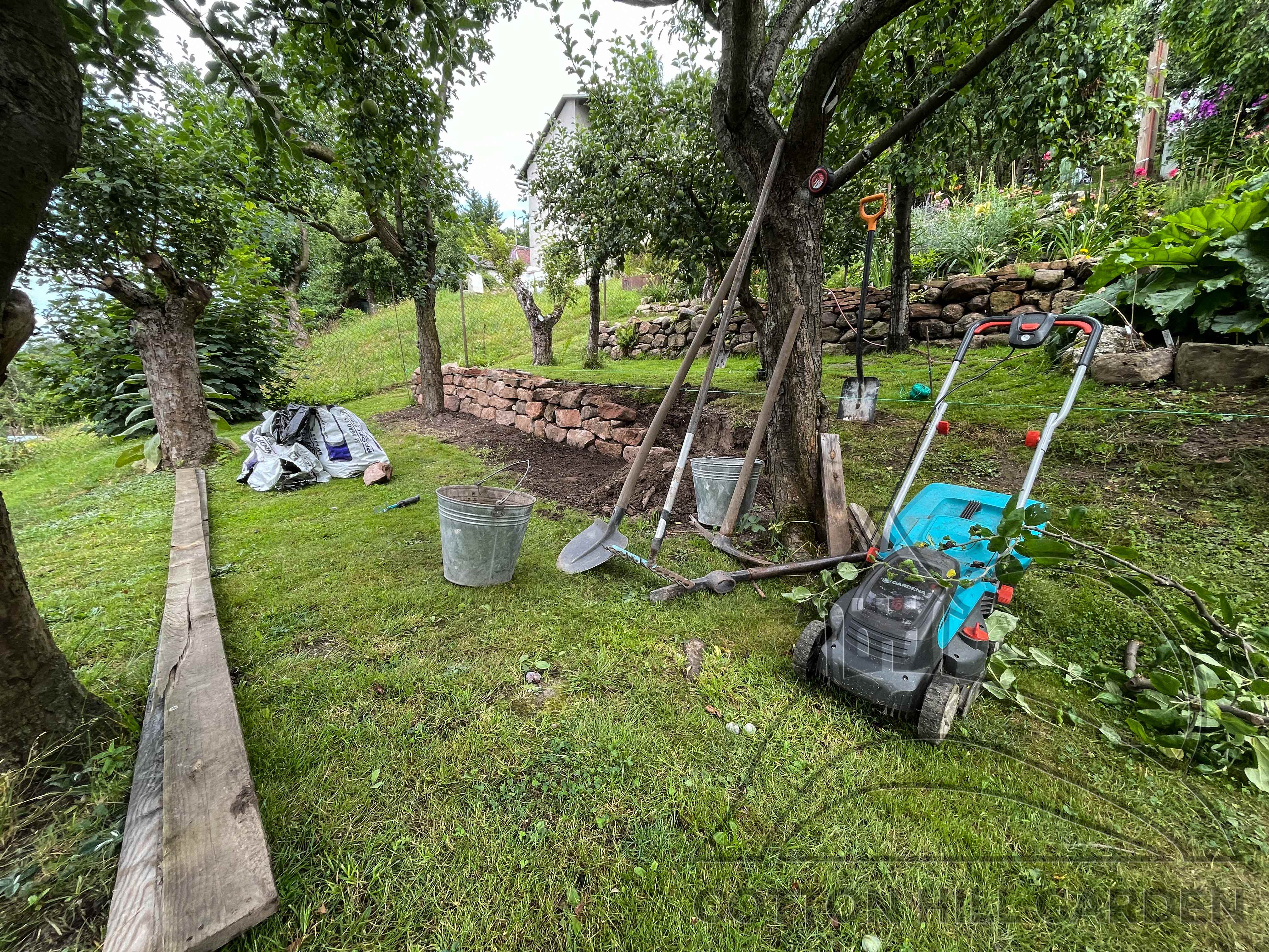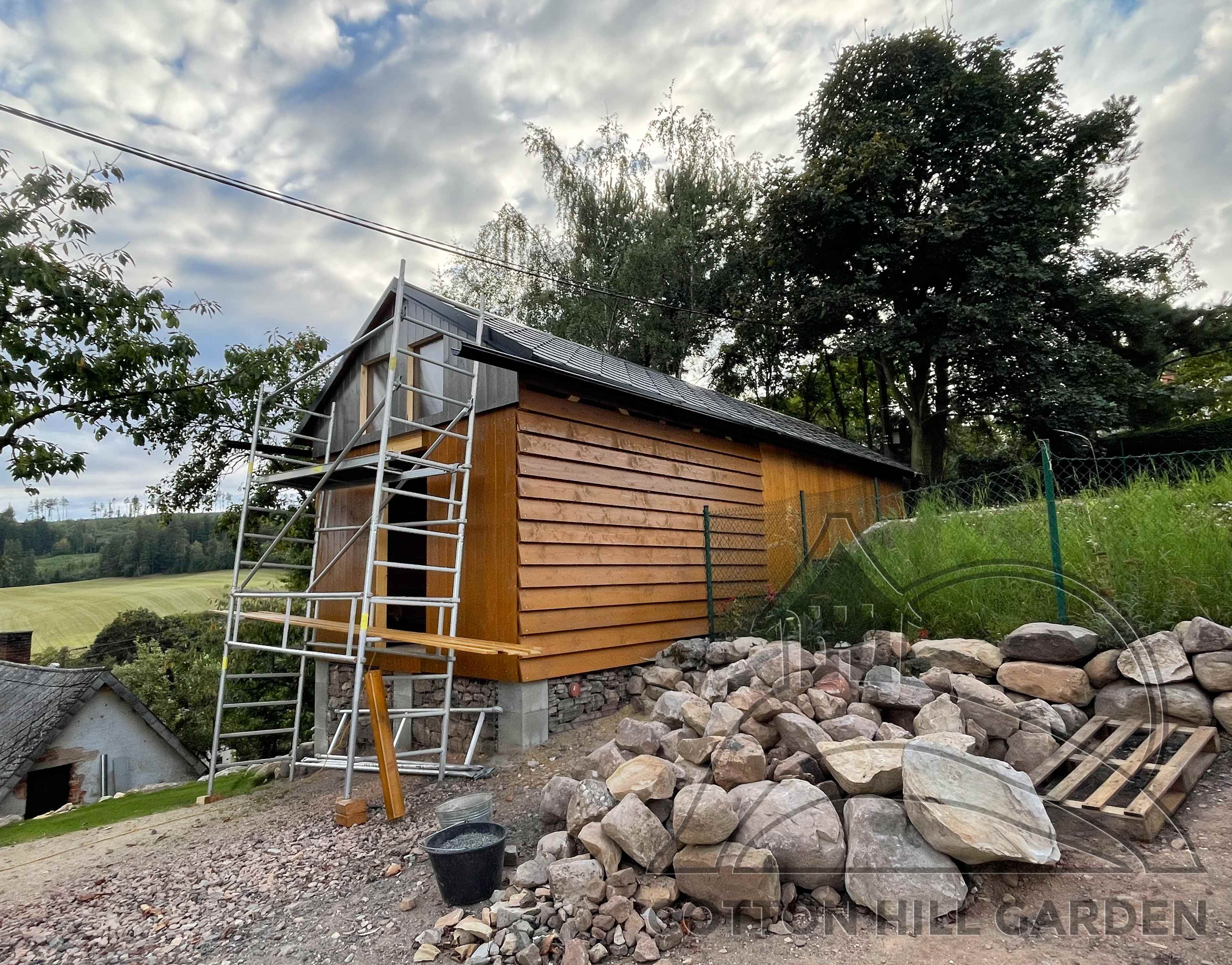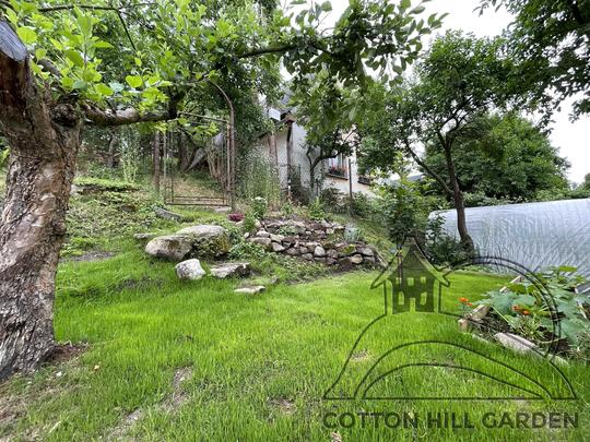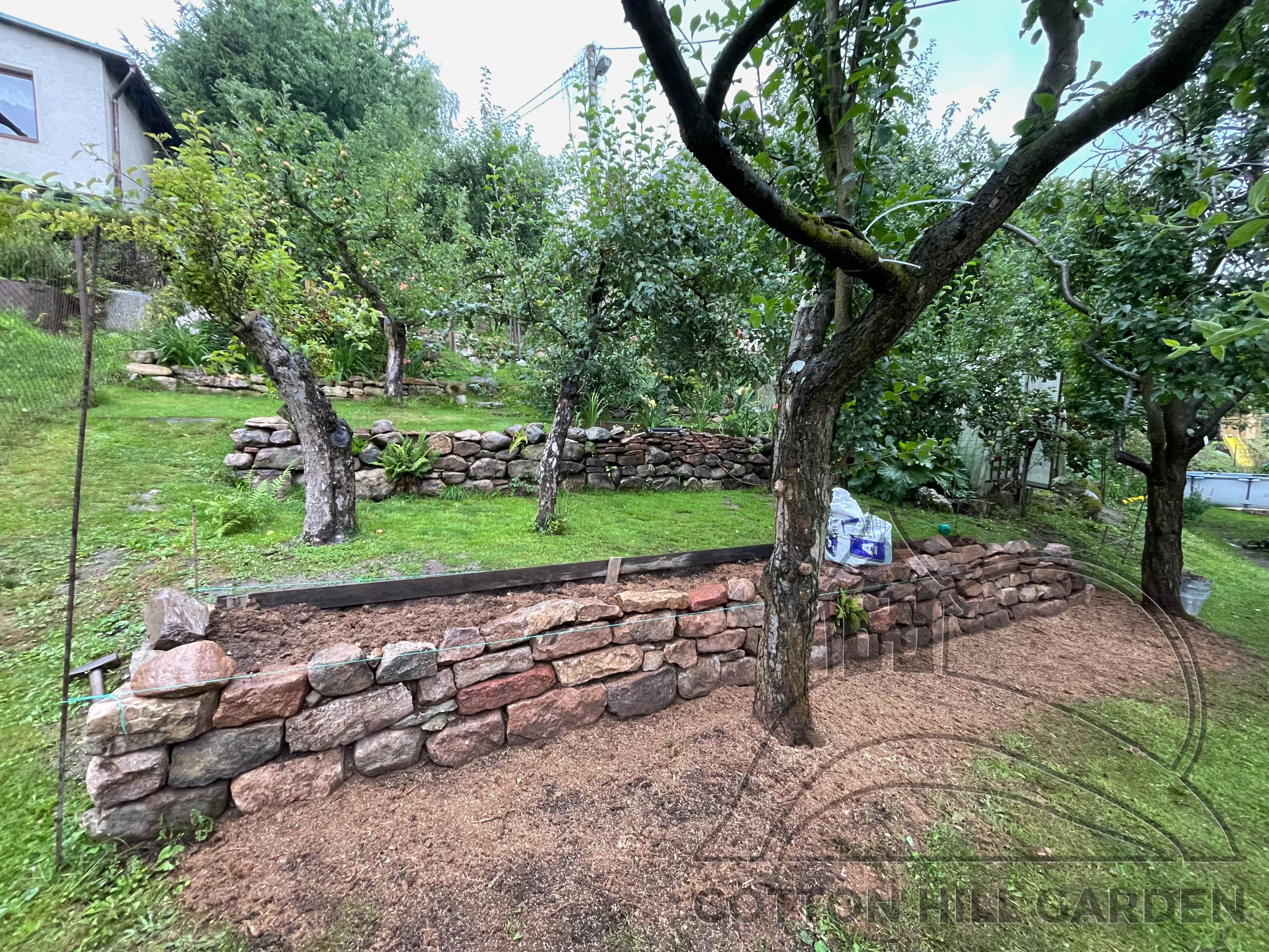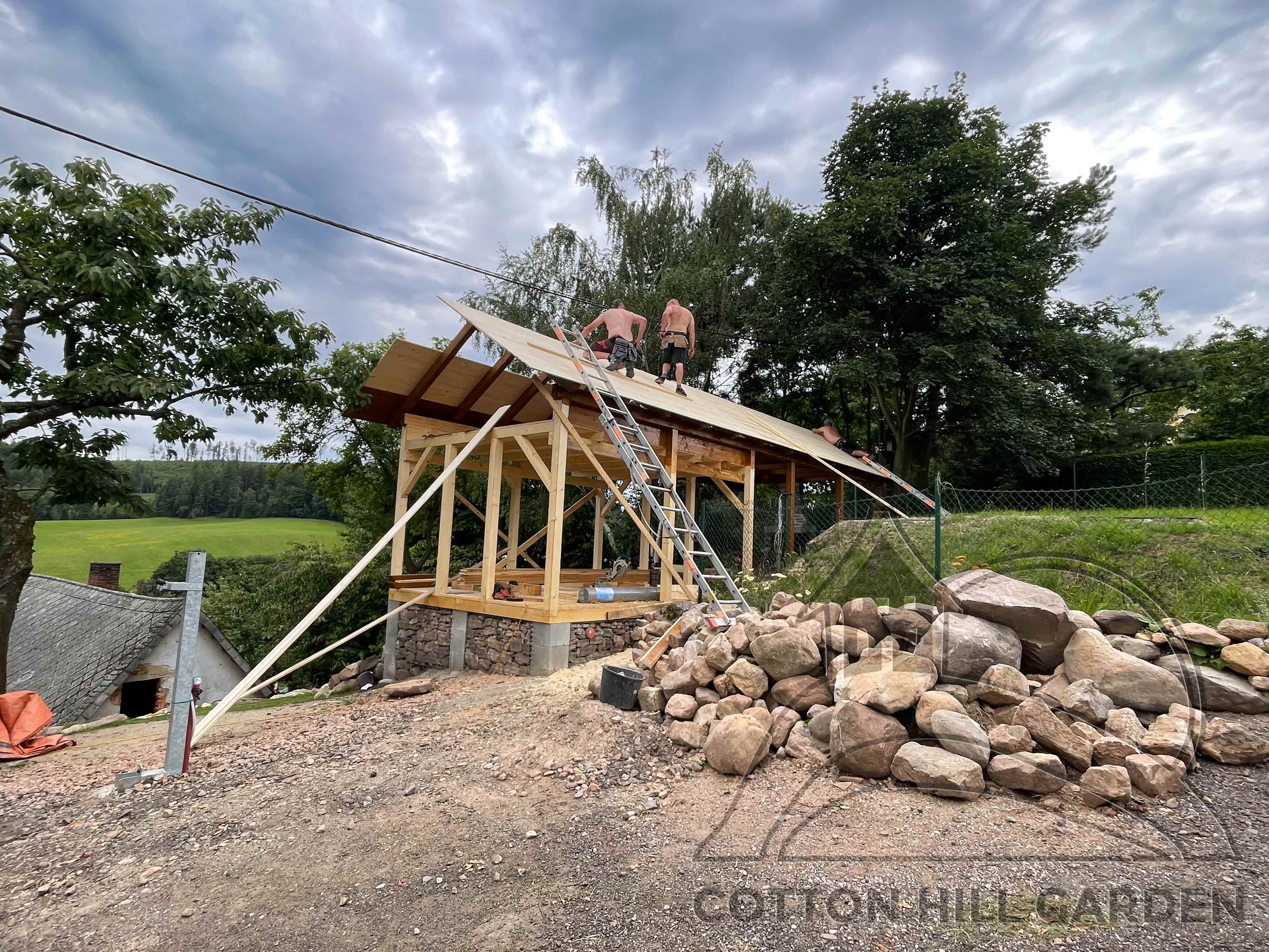 ZPŘÍSTUPNÍ DŮM PRO ÚČELY BUDOUCÍ STAVBY, VYTVÁŘÍ TRAVNATOU TERASU S KRÁSNÝM VÝHLEDEM DO KRAJINY. V NEPOSLEDNÍ ŘADĚ TARAS BUDE DOMOVEM ČAROVĚNÍKŮ, AZALEK A SKALNIČEK.