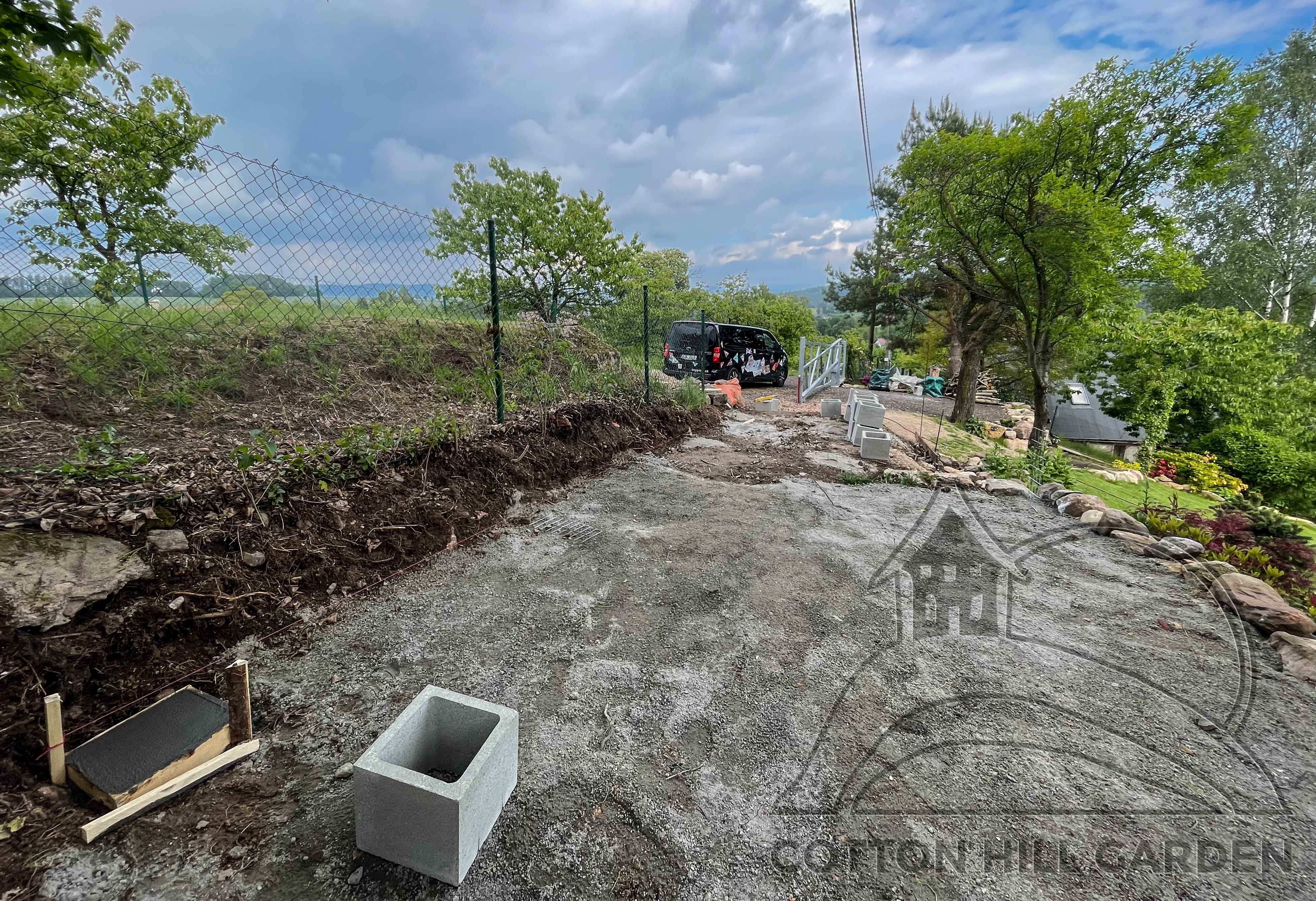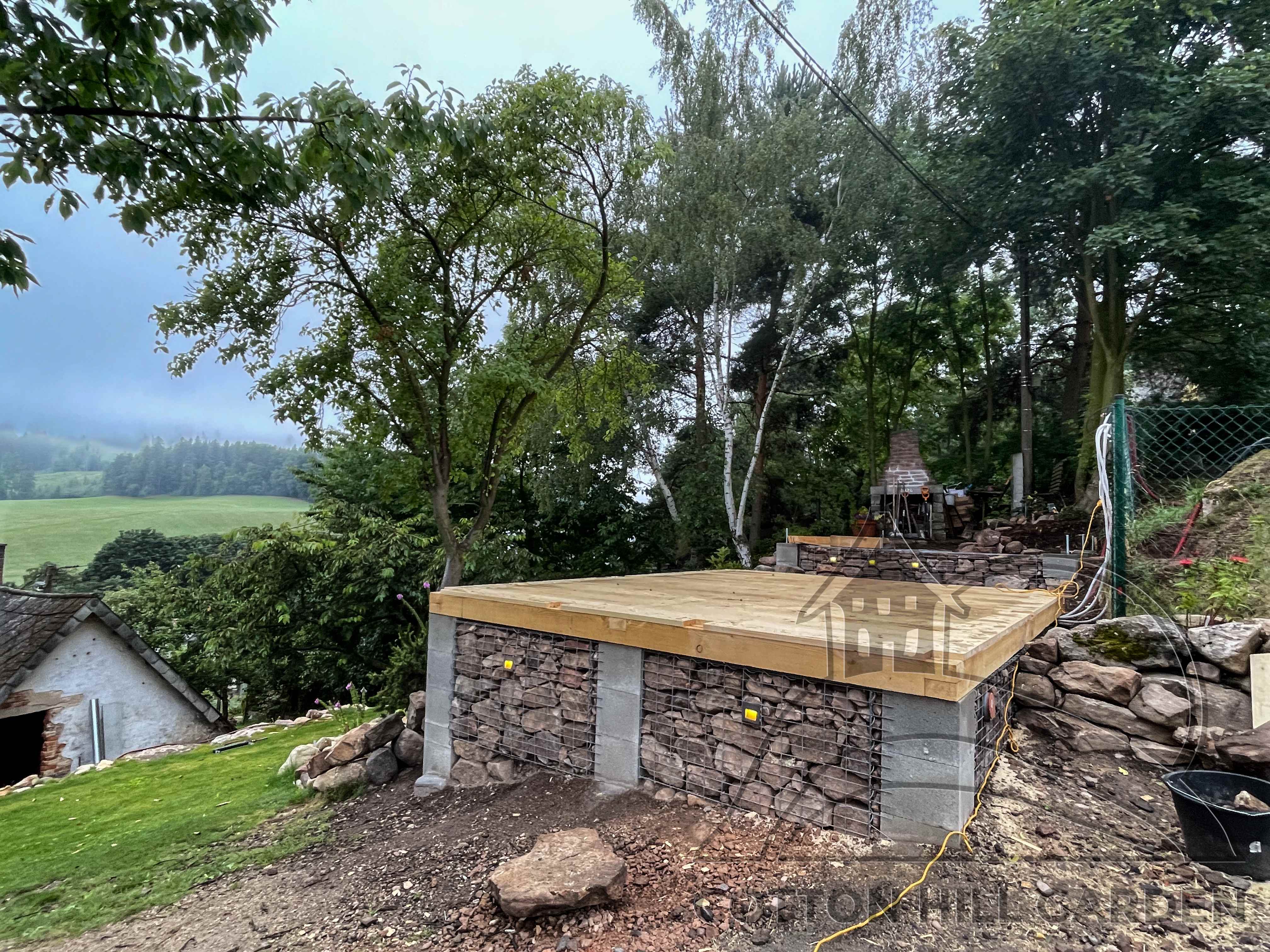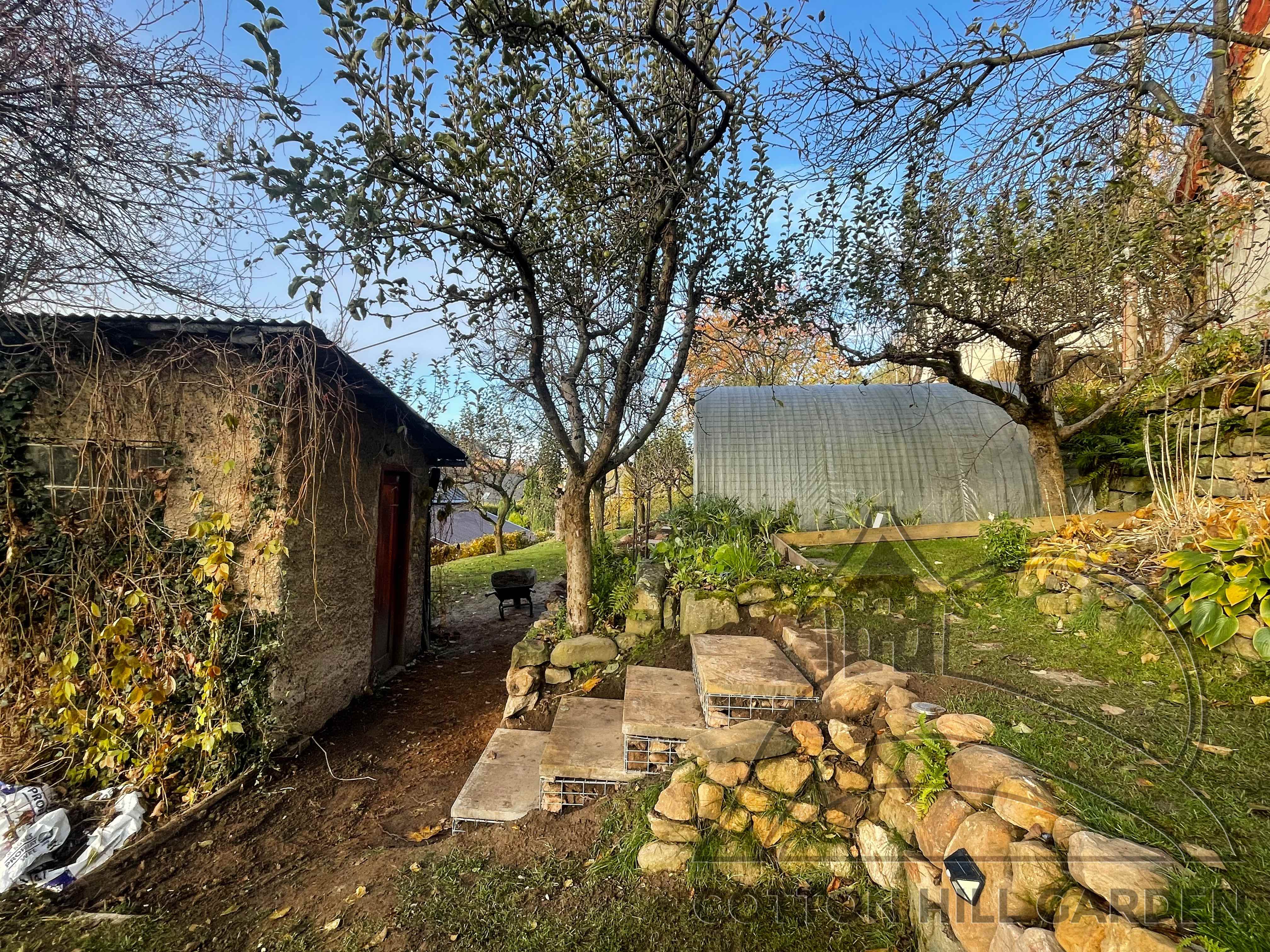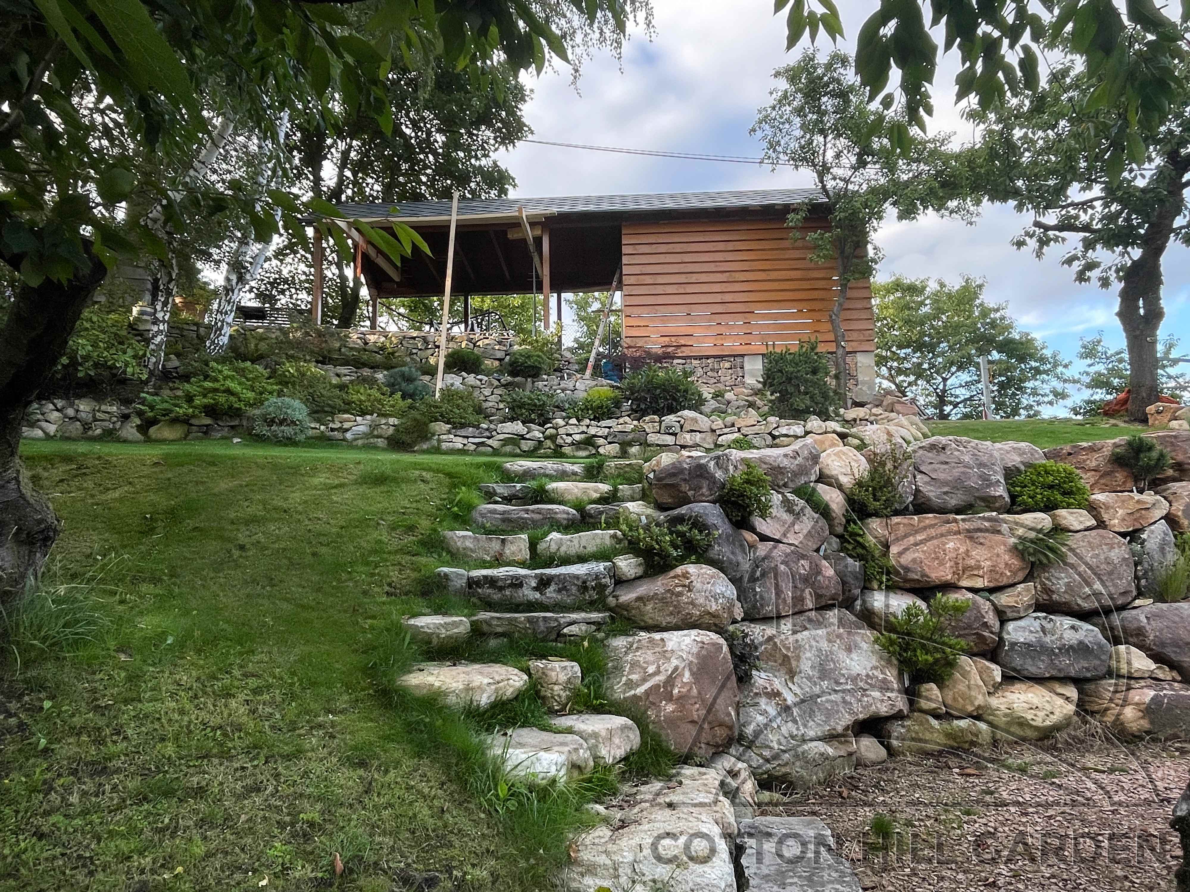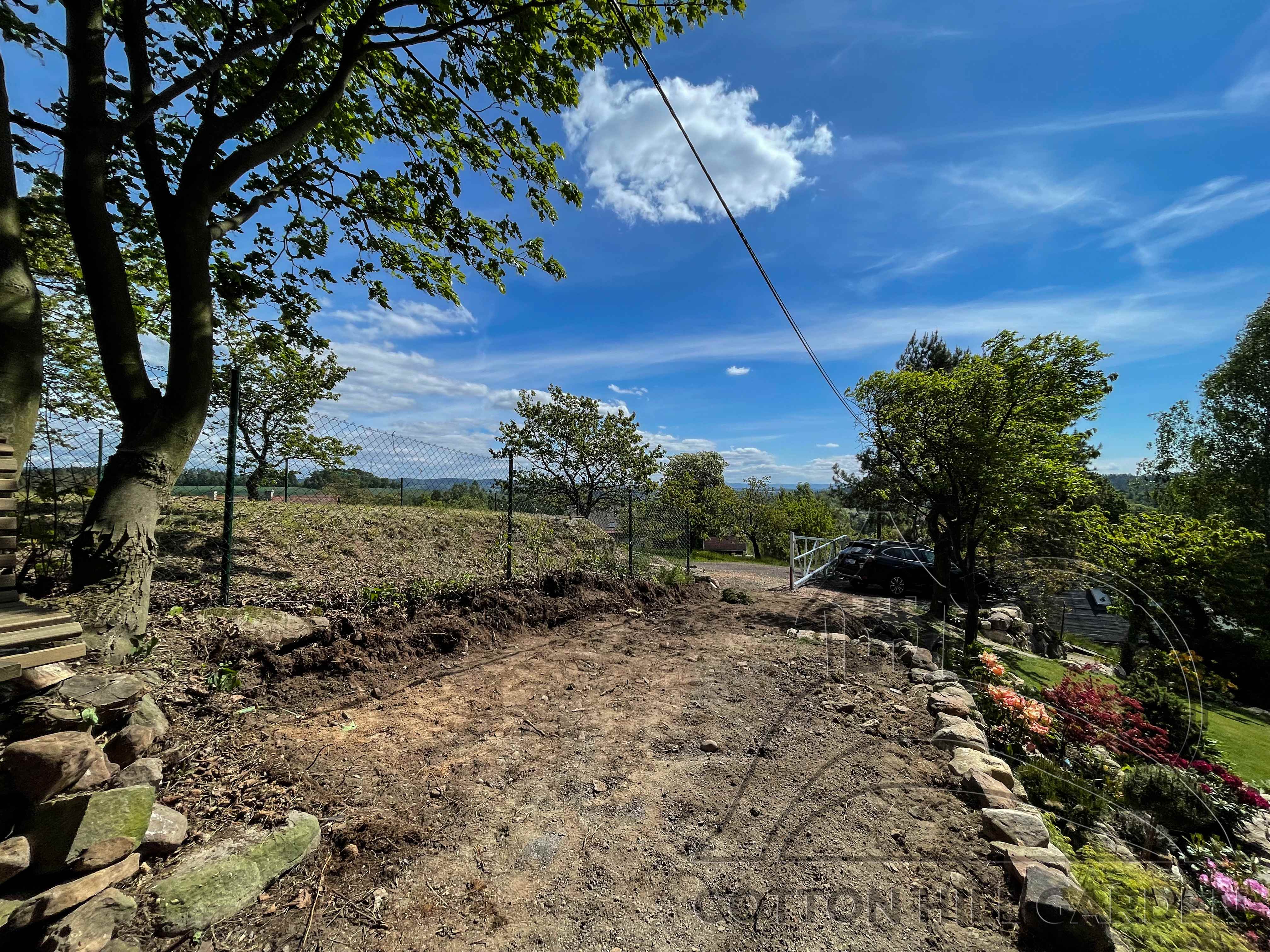ZPŘÍSTUPNÍ DŮM PRO ÚČELY BUDOUCÍ STAVBY, VYTVÁŘÍ TRAVNATOU TERASU S KRÁSNÝM VÝHLEDEM DO KRAJINY. V NEPOSLEDNÍ ŘADĚ TARAS BUDE DOMOVEM ČAROVĚNÍKŮ, AZALEK A SKALNIČEK.