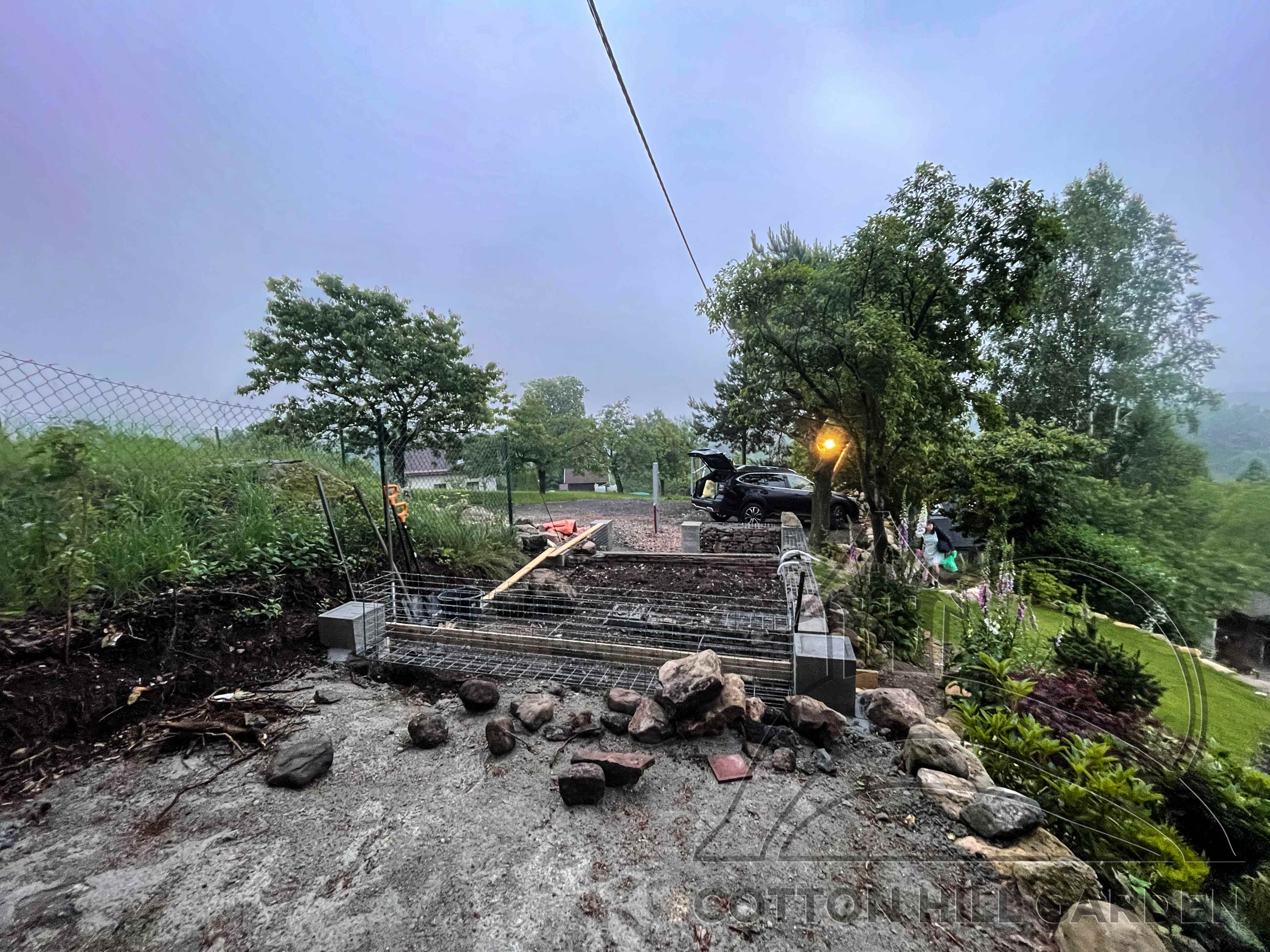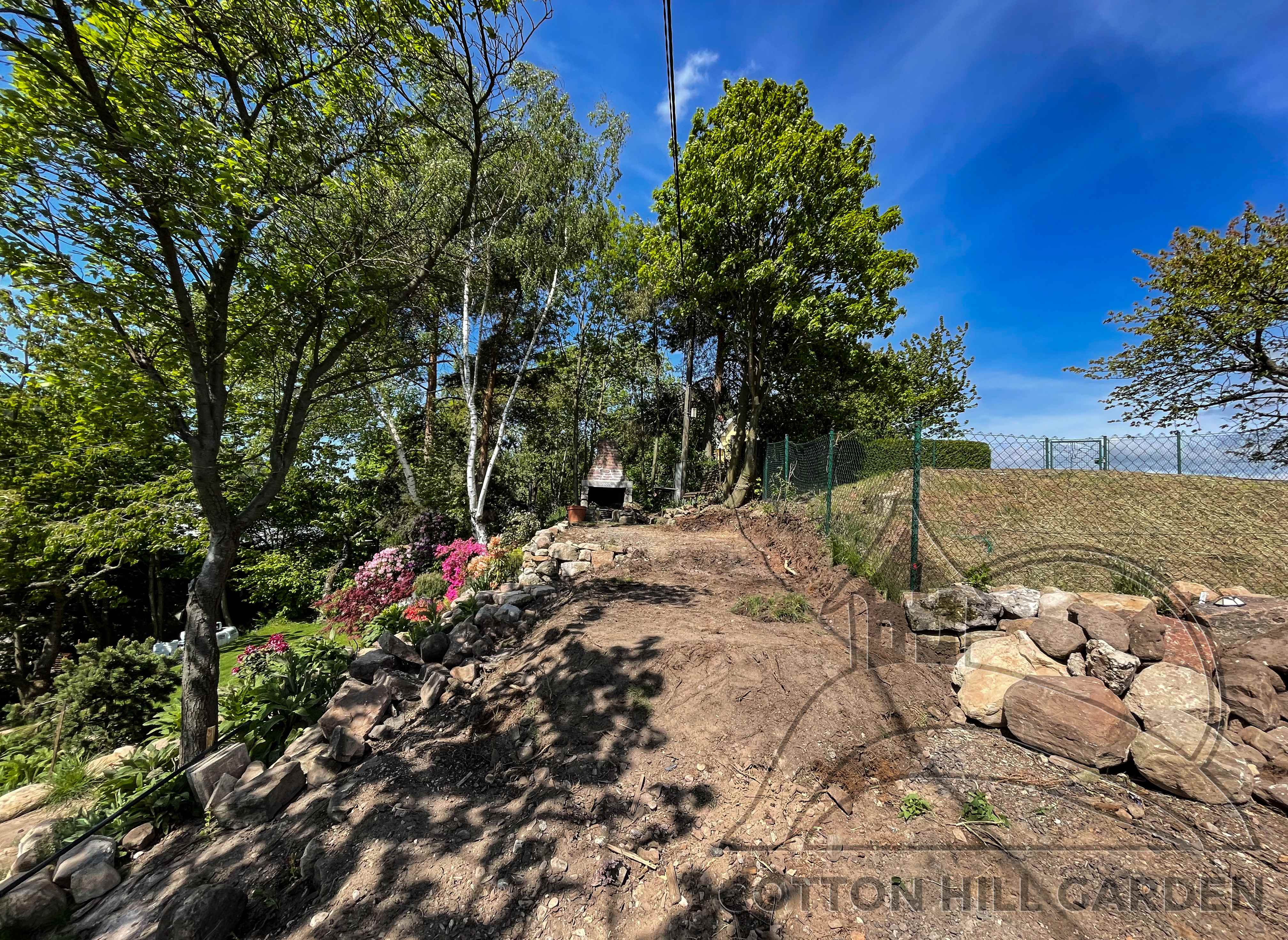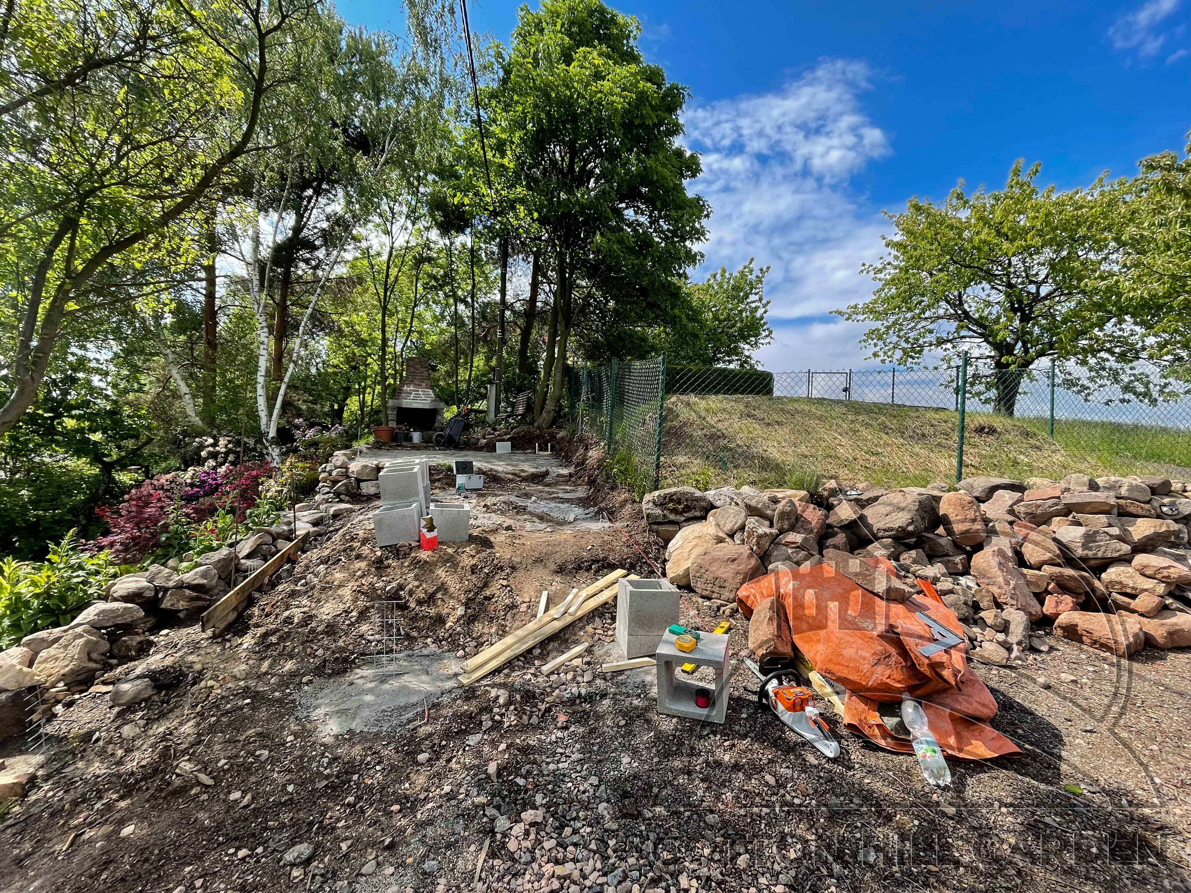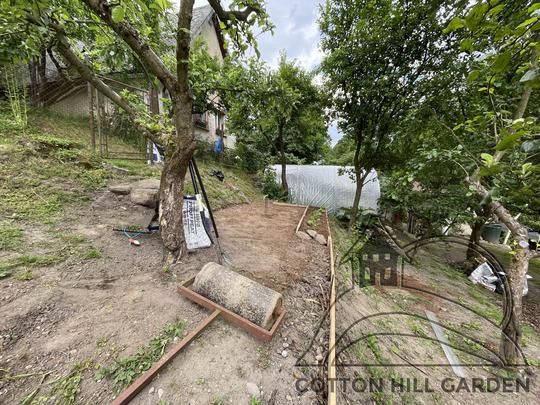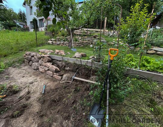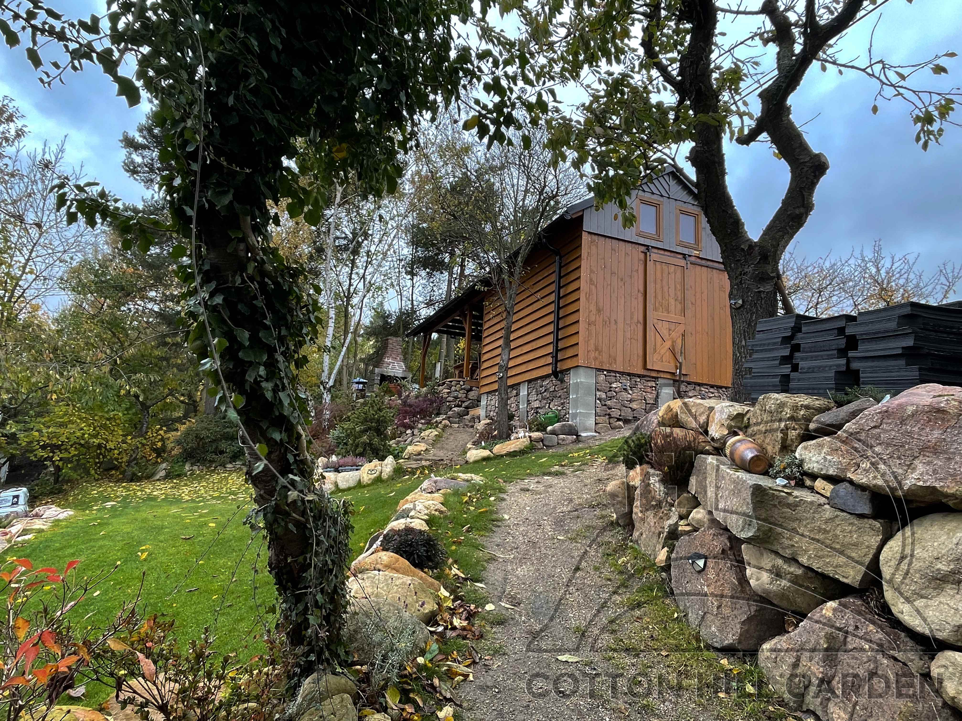 ZPŘÍSTUPNÍ DŮM PRO ÚČELY BUDOUCÍ STAVBY, VYTVÁŘÍ TRAVNATOU TERASU S KRÁSNÝM VÝHLEDEM DO KRAJINY. V NEPOSLEDNÍ ŘADĚ TARAS BUDE DOMOVEM ČAROVĚNÍKŮ, AZALEK A SKALNIČEK.