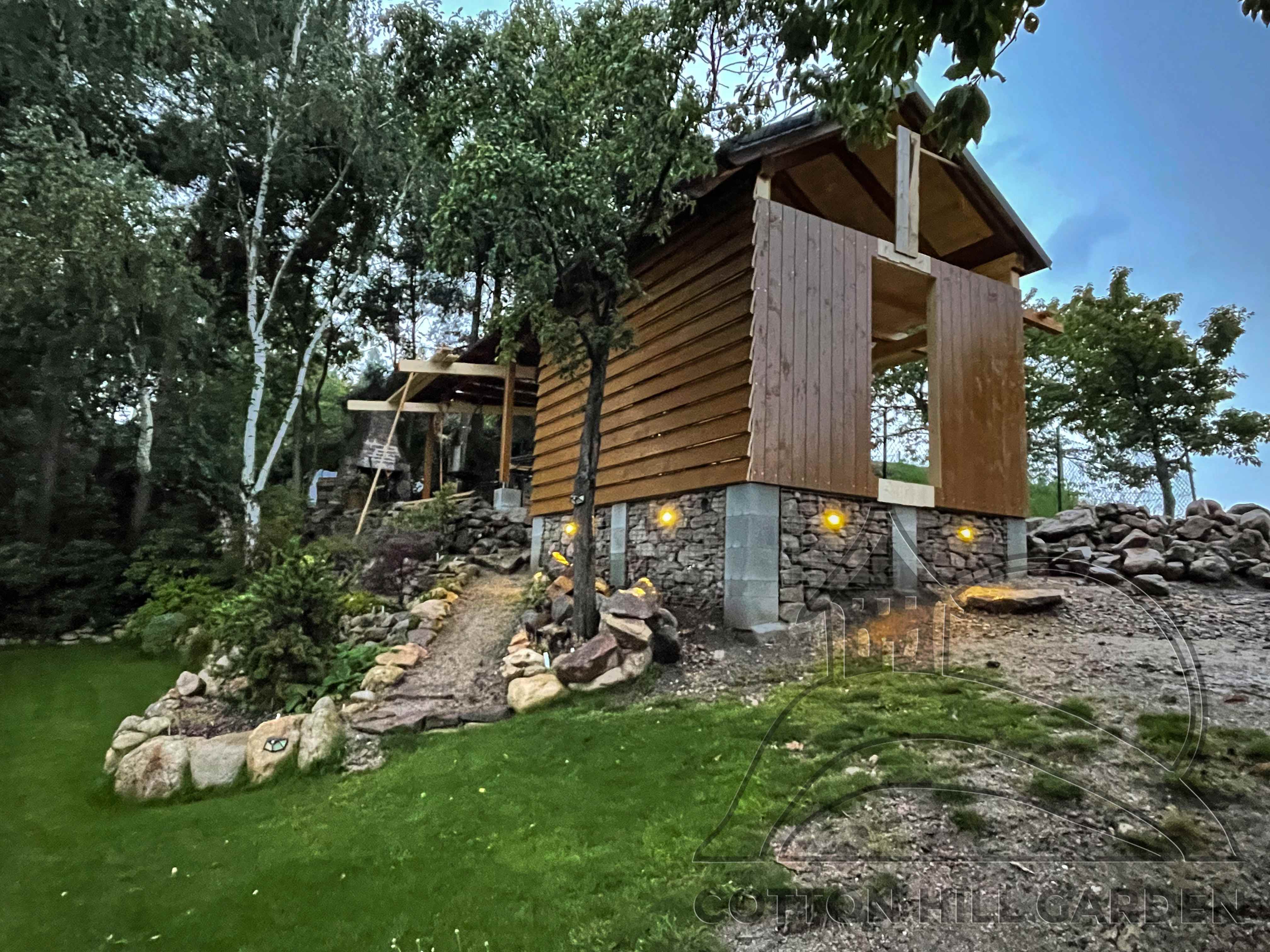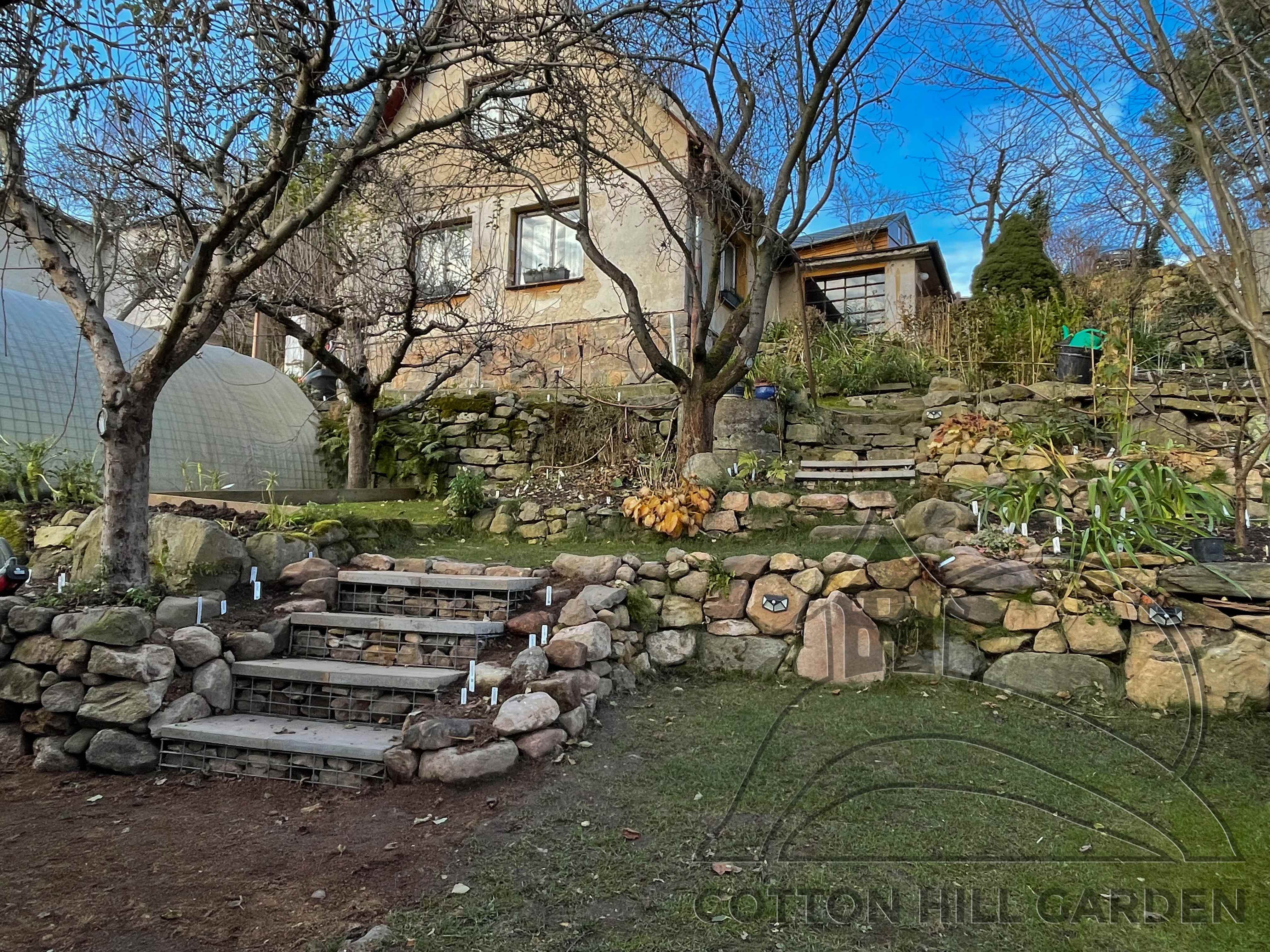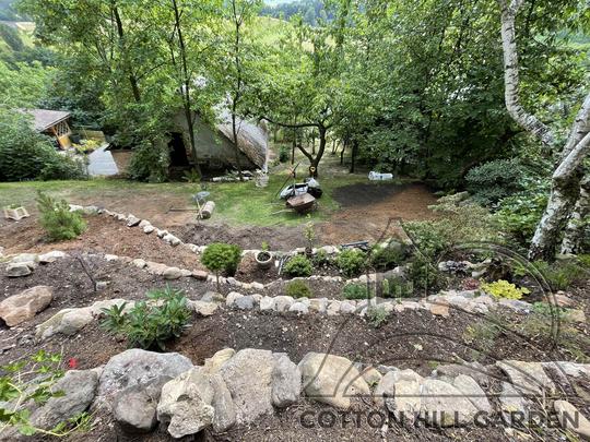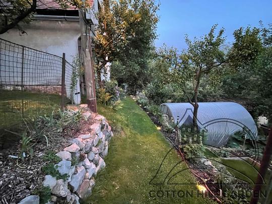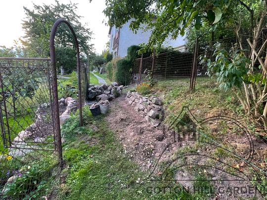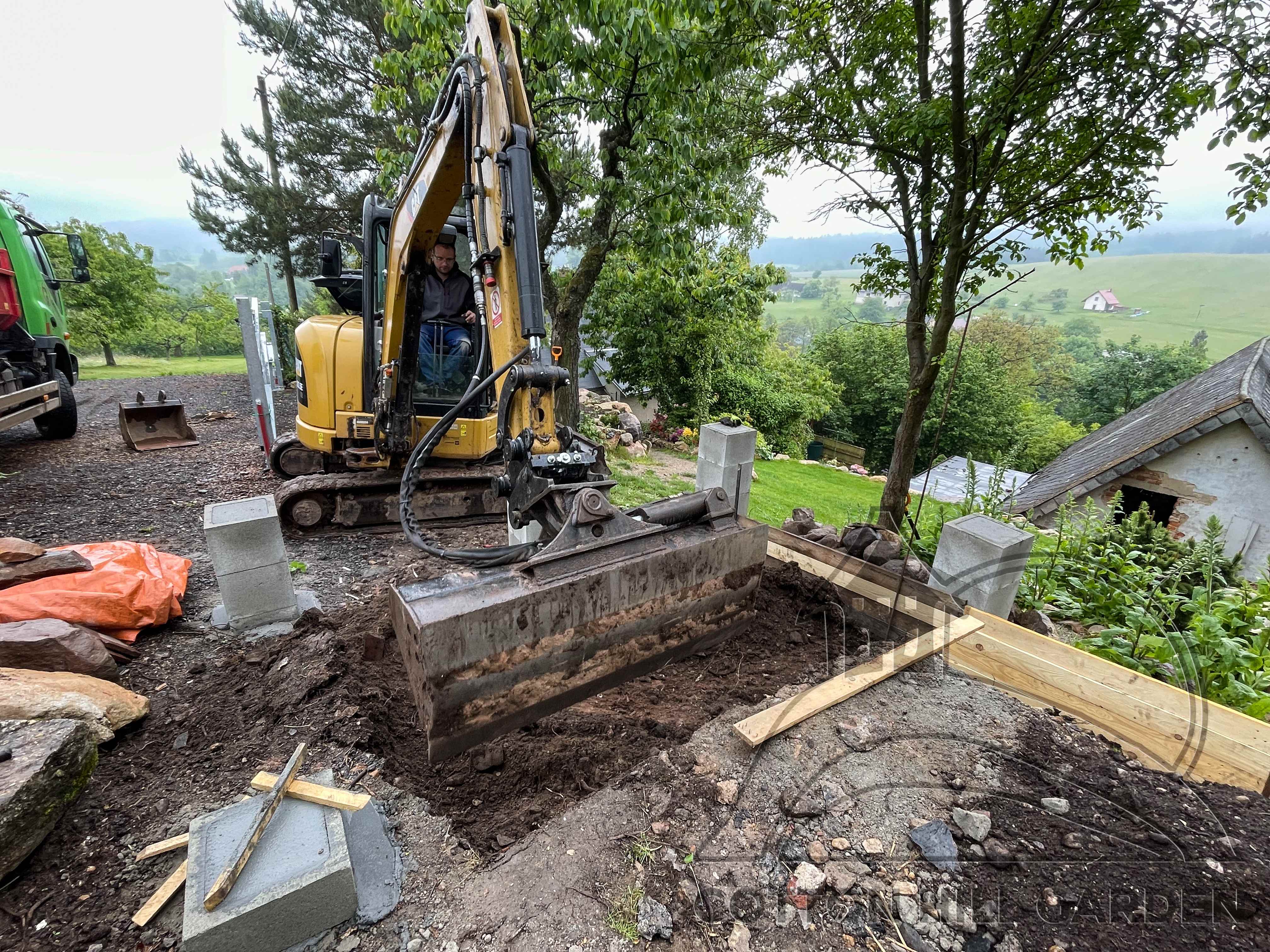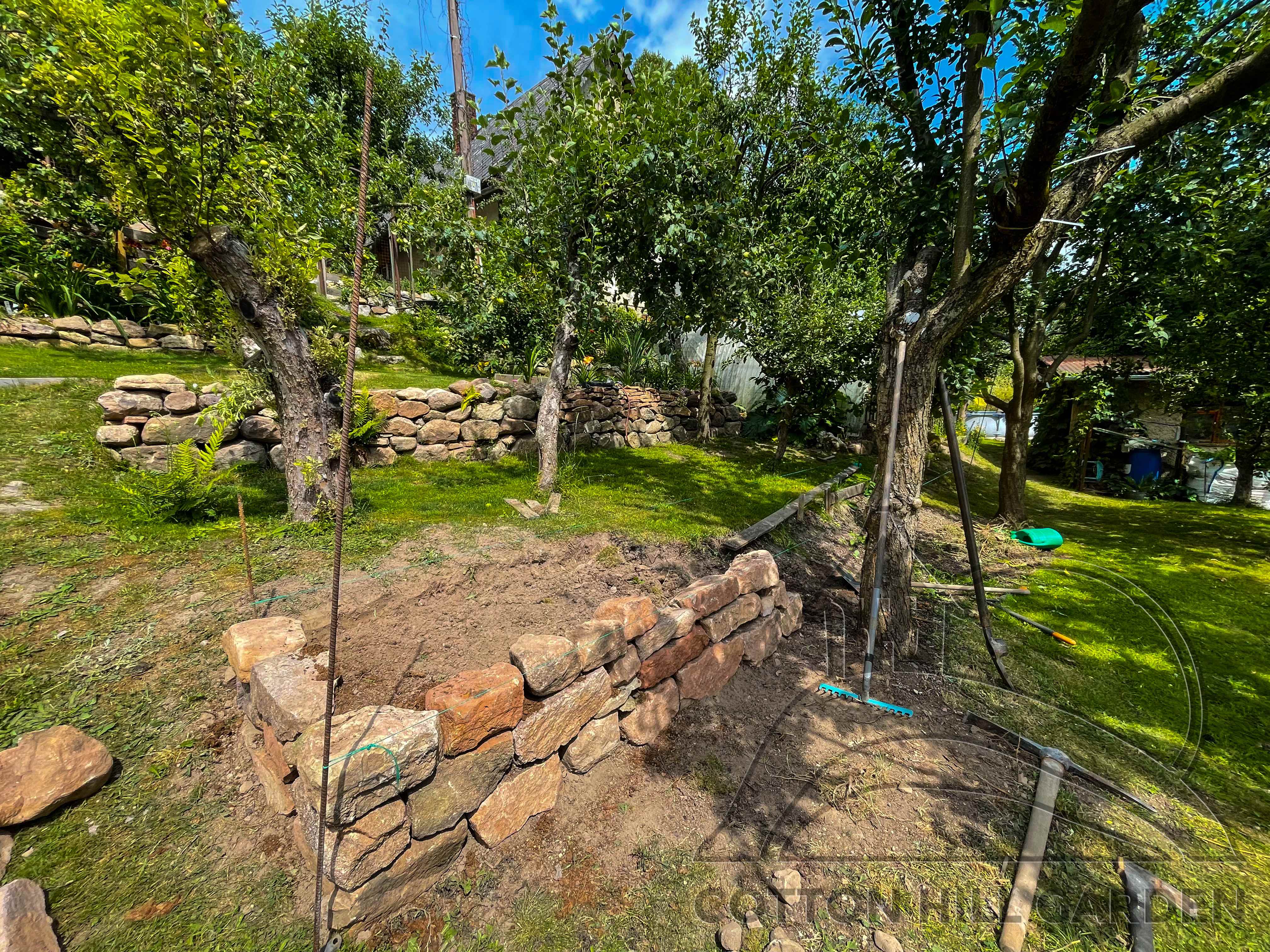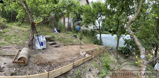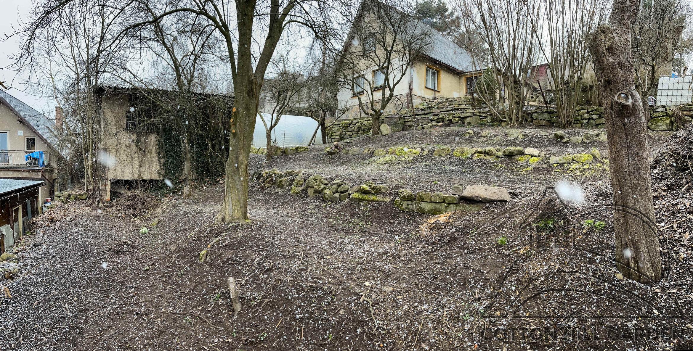 ZPŘÍSTUPNÍ DŮM PRO ÚČELY BUDOUCÍ STAVBY, VYTVÁŘÍ TRAVNATOU TERASU S KRÁSNÝM VÝHLEDEM DO KRAJINY. V NEPOSLEDNÍ ŘADĚ TARAS BUDE DOMOVEM ČAROVĚNÍKŮ, AZALEK A SKALNIČEK.